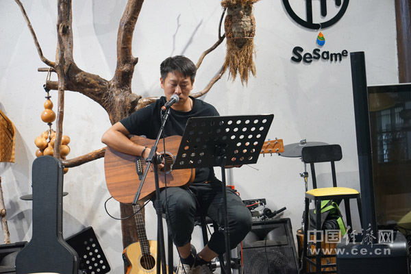 民谣小院里,歌手在自弹自唱。(中国经济网记者 于鹤章/摄)
